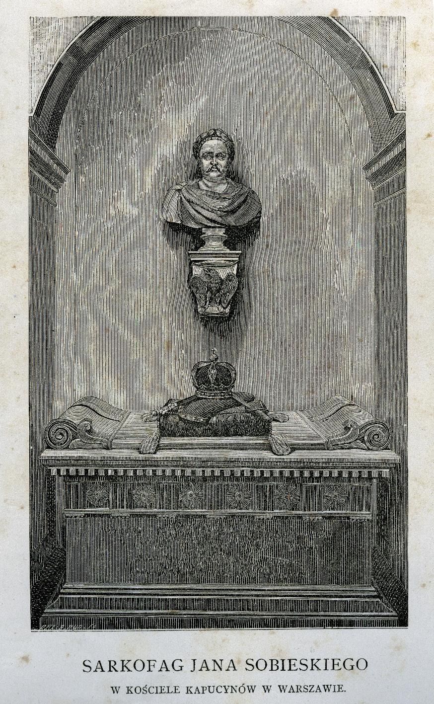 Kolorowe zdjęcie współczesne. Przedstawia sarkofag znajdujący się w Mauzoleum Serca Jana III Sobieskiego w kościele kapucynów w Warszawie. W niszy, nad trumną, znajduje się popiersie  Jana III Sobieskiego.