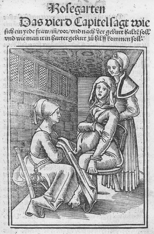 Rycina przedstawia ciasne wnętrze, a w nim trzy kobiety. Kobieta ciężarna siedzi na krześle, w centrum kompozycji. Za nią stoi kobieta, która ją podtrzymuje. Z lewej strony klęczy akuszerka, która obiera poród.