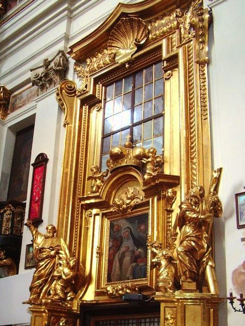 Współczesna fotografia kolorowa. Przedstawia wnętrze kościoła. Jest to XVIII-wieczne wyposażenie kościoła Dominikanów w Wilnie.