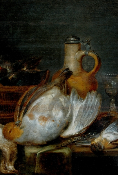 Obraz olejny. Przedstawia ciemne wnętrze w którym znajdują się ludzie. Na pierwszym planie kupa wielkich garów leżących na ziemi. Po prawej stronie kobieta przy stole. Obok niej na podłodze leży miska. W głębi pomieszczenia kobieta i mężczyzna. Jest to obraz „Wnętrze kuchni” Davida Teniersa Młodszego.
