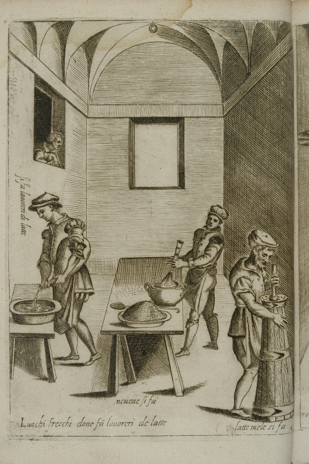 Stara rycina. Przedstawia wnętrze kuchni w którym stoi mężczyzna przy piecu i gotuje. W głębi stoi stół. Na ścianie wiszą talerze. Z prawej strony przez otwarte drzwi wchodzi mężczyzna z tacą. Jest to ilustracja "Kucharstwo" z elementarza Jana Amosa Komenskiego.