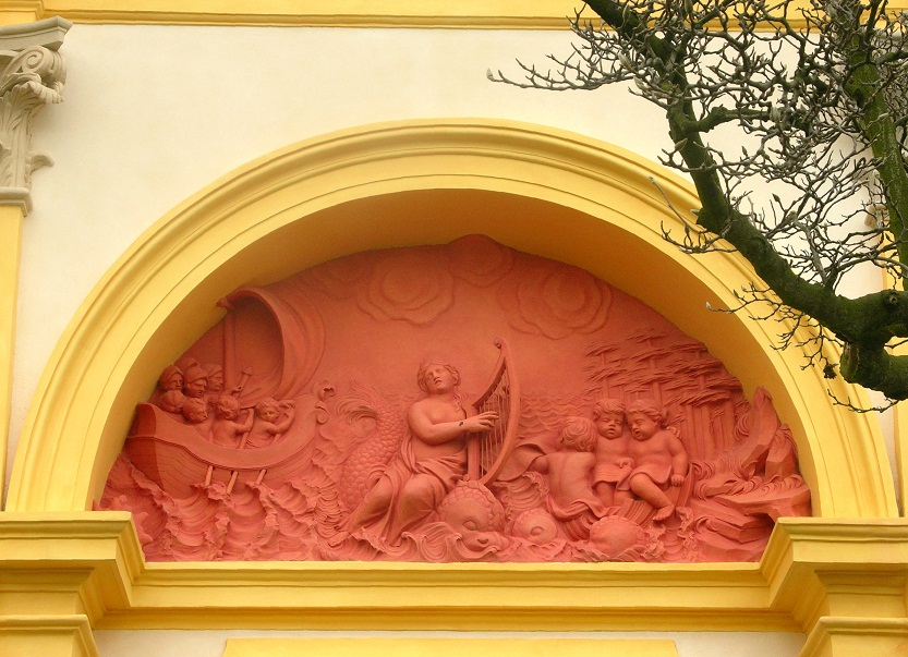 Innym sławnym poetą i śpiewakiem dobrze widocznym na płaskorzeźbie znajdującej się w prawym łuku był Arion. Grecki historyk Herodot w pierwszej księdze swych Dziejów powiada, że Arion udał się na Sycylię, gdzie bawił swą grą i śpiewem tamtejszych mieszkańców. Dzięki swym występom pieśniarz zgromadził znaczny majątek. W drodze powrotnej do Koryntu zorientował się, że marynarze czyhają na jego dobra i chcą go zabić. Zdołał uprosić napastników, aby po raz ostatni pozwolili mu zaśpiewać. Gdy skończył pieśń, skoczył w otchłań morską. Ale nie utopił się. Uratowały go delfiny. Na grzbiecie jednego z nich Arion dotarł bezpiecznie do lądu. Aby upamiętnić to niezwykłe wydarzenie, władca Olimpu, jak zapewnia poeta Owidiusz w swym Kalendarzu poetyckim, zamienił delfina w konstelację niebieską: „Bogowie widzą zbożne czyny: Jowisz uniósł delfina na niebo i dał mu dziewięć Gwiazd”. W dobie nowożytnej Arion stał się postacią alegoryczną. Symbolizował cnotę, która częściej ujawnia się wśród obcych niż we własnej ojczyźnie. Postać śpiewaka mogła być więc aluzją do urodzonej we Francji żony Jana III.