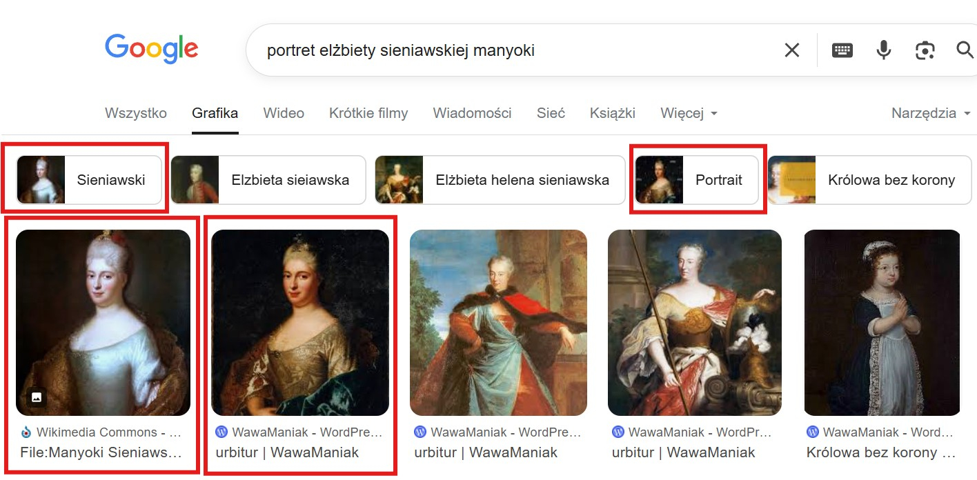 - Il. 3 – Wyniki wyszukiwania grafiki w wyszukiwarce Google po wpisaniu hasła „portret elzbiety sieniawskiej manyoki” z zaznaczeniem wizerunków portretu z Muzeum Sztuk Pięknych – Węgierskiej Galerii Narodowej przed i po konserwacji, zrzut ekranowy wykonany 29.09.2025.