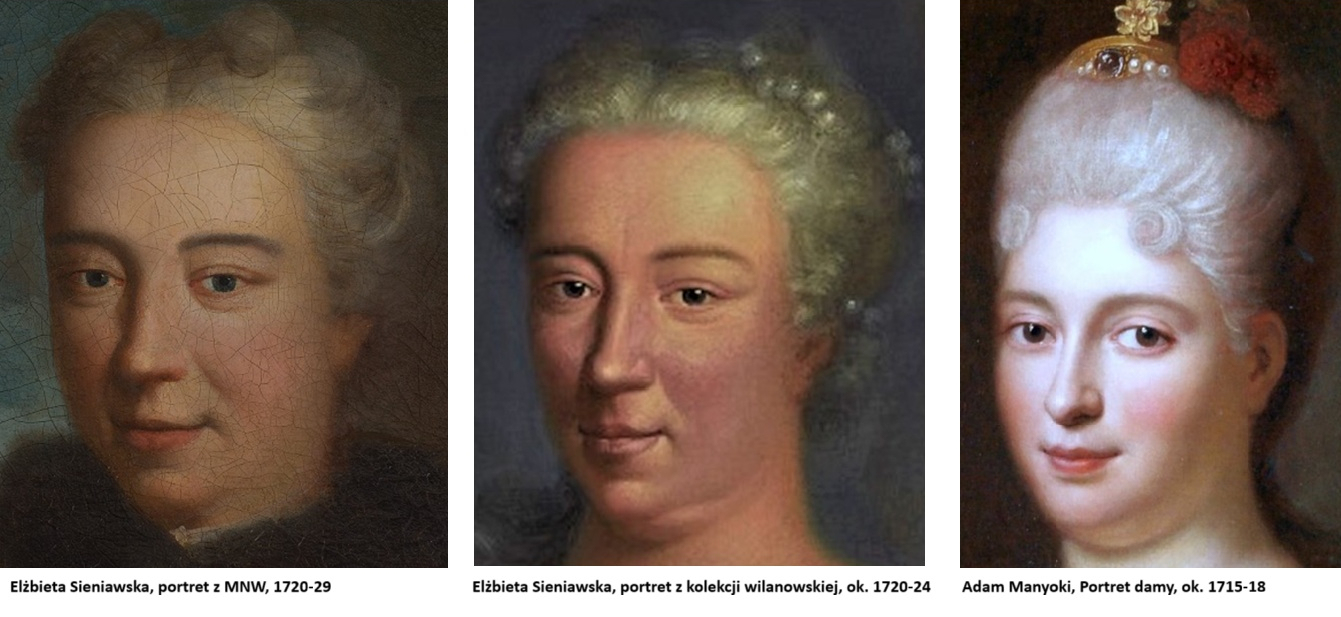 Wróćmy jeszcze na chwilę do książki Rafała Nestorowa. Autor napisał o dwóch portretach Sieniawskiej – oba miały pochodzić z pracowni Mányokiego, z tego samego okresu (około 1715–1718) i ze zbiorów Narodowej Galerii w Budapeszcie (co stwierdza przypis 137 na s. 40). Trudno nie oprzeć się wrażeniu, że informacja o dwóch portretach ma swoje źródło w funkcjonowaniu w przestrzeni Internetu dwóch podobnych, ale wyraźnie różniących się istotnymi szczegółami portretów (zob. wyniki wyszukiwania grafiki w Google dla hasła „portret elzbiety sieniawskiej manyoki”). Tymczasem jest to jeden i ten sam portret, tylko sfotografowany przed konserwacją i po konserwacji, co dokumentuje wspomniana już publikacja z 2014 roku o przeprowadzonych przy płótnie pracach. Różnica w obu wersjach, przed i po konserwacji, jest dość znaczna i może prowadzić do pomyłki, że chodzi o dwa różne dzieła. Na stronie Wikipedii (https://commons.wikimedia.org/wiki/File:Manyoki_Sieniawska.JPG), wśród danych o portrecie z jego wizerunkiem po konserwacji, znajduje się wzmianka „Other versions” („Inne wersje”) z fotografią obrazu sprzed rozpoczęcia prac. Owe „inne wersje” można oczywiście rozumieć dość dowolnie, także jako zbliżone ikonograficznie, ale jednak różne dzieła malarstwa. Stąd być może omyłkowa informacja w książce Nestorowa o dwóch portretach.