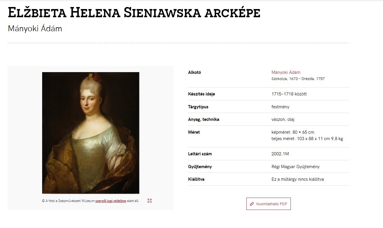 Uczciwie należy przyznać, że dalej nie mamy żadnego przekonującego dowodu, że na obrazie z budapeszteńskiego muzeum widnieje Elżbieta Sieniawska, choć z drugiej strony nie da się tego wykluczyć. W konsekwencji chodzi tutaj nie tyle o obalenie atrybucji, co o zwrócenie uwagi, że najwyraźniej oparto ją na bardzo wątłych podstawach i w związku z tym nie należy przyjmować jej za pewnik. Interesujące, że na stronie internetowej Muzeum Sztuk Pięknych – Węgierskiej Galerii Narodowej w Budapeszcie (https://www.szepmuveszeti.hu/mutargyak/33742/ ) nota autorstwa Mangi Pattantyús, tożsama co do treści z jej opracowaniem z katalogu Elżbieta Sieniawska. Królowa bez korony, zwieńczona została tytułem „Elžbieta Helena Sieniawska arcképe” („Portret Elżbiety Heleny Sieniawskiej). Uważne oko dostrzeże jeszcze na końcu tekstu zdanie, które w tłumaczeniu brzmi: „Ze względu na trwające badania informacje dotyczące dzieła mogą ulec zmianie”. I to jest chyba najlepsze podsumowanie dyskusji.