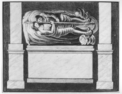 Rysunek podmalowywany akwarelą. Płyta nagrobna z postaciami męskimi w zbrojach. Leżą oni na płasko z zamkniętymi oczami na podniesieniu, którego boczna ściana jest w całości zapełniona treścią po łacinie. Jest to nagrobek ostatnich książąt mazowieckich - Stanisława i Janusza w katedrze w Warszawie.