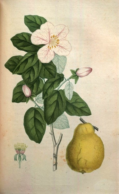 Barwna ilustracja, która może pochodzić z czasopisma lub książki. Przedstawia gałąź z białym kwiatem i zielonymi listkami oraz żółtym, dorodnym owocem pigwy.