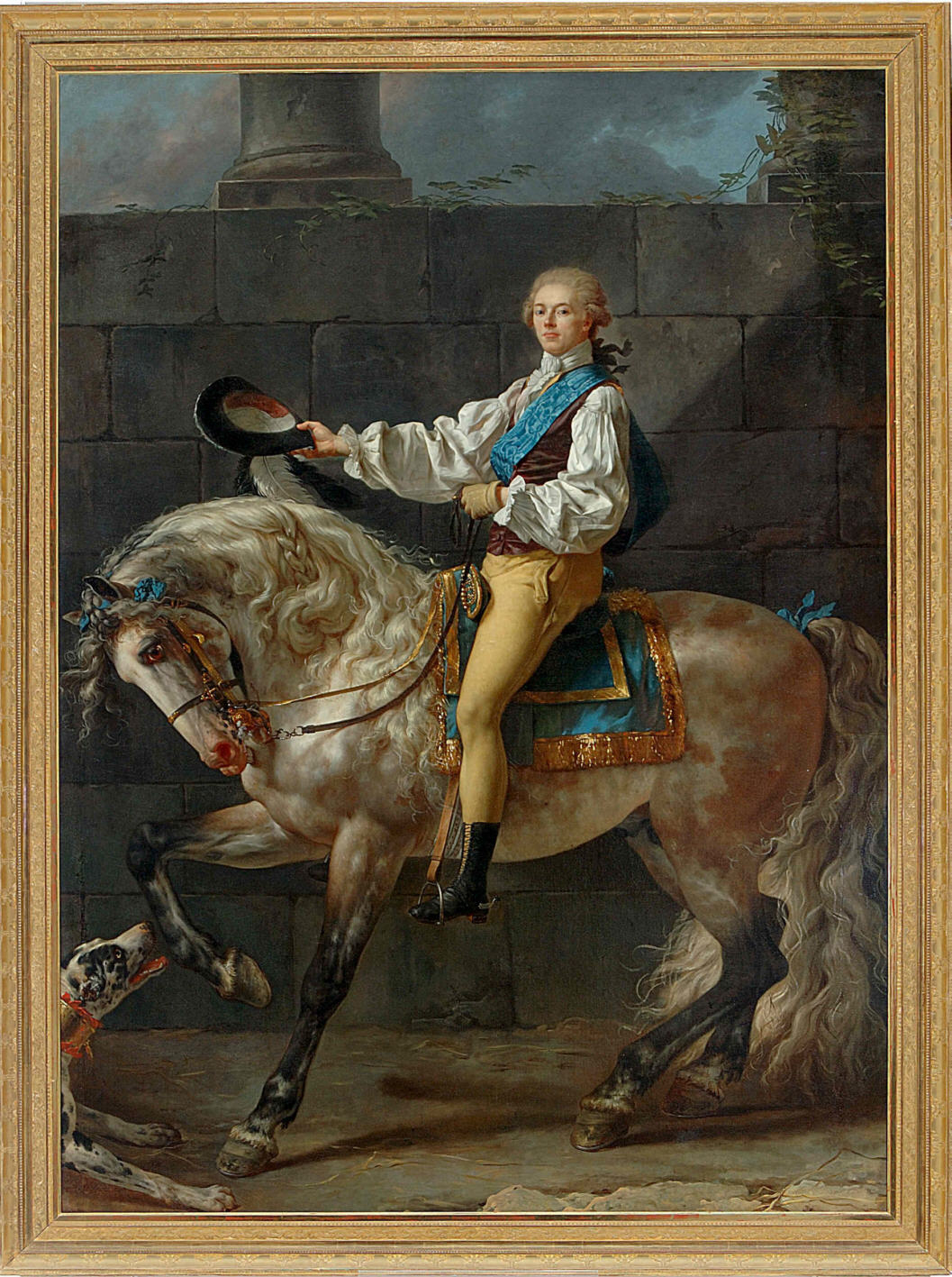 Czarno-biała reprodukcja. Przedstawia młodego mężczyznę ubranego w strój historyczny, który siedzi na koniu. Mężczyzna trzyma w prawej ręce kapelusz, lewą ręką trzyma za uzdy konia. Scena na tle muru. Po prawej stronie pies ujadający na konia. Koń pochyla głowę w jego stronę. Jest to portret Stanisława Kostki Potockiego, rycina Julesa Davida wg pierwowzoru Jacquesa-Louisa Davida.