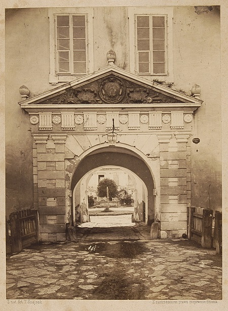 Fotografia XIX-wiecznej ryciny z widokiem na miasto. Pośrodku kościół, po prawej stronie wysoki budynek, częściowo zniszczony. W tle niskie domostwa.  Jest to widok Żółkwi w XVIII w.