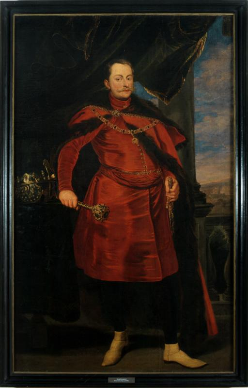 Portret mężczyzny w średnim wieku z wąsem. Ogolona głowa, duże i ciemne oczy. Stoi na tle ciemnych murów. Ubrany w strój historyczny. W prawej ręce trzyma zwinięty zwój, lewą opiera na szabli. Z lewej strony na stole leży korona. U góry, po lewej orzeł - symbol Polski. Jest to portret króla Jana Kazimierza.