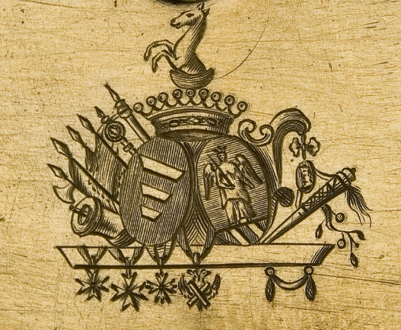Czarno-białe, archiwalne zdjęcie przedstawia przedmiot, najprawdopodobniej guzik. Na jego powierzchni herb. Jest to herb Pilawa.