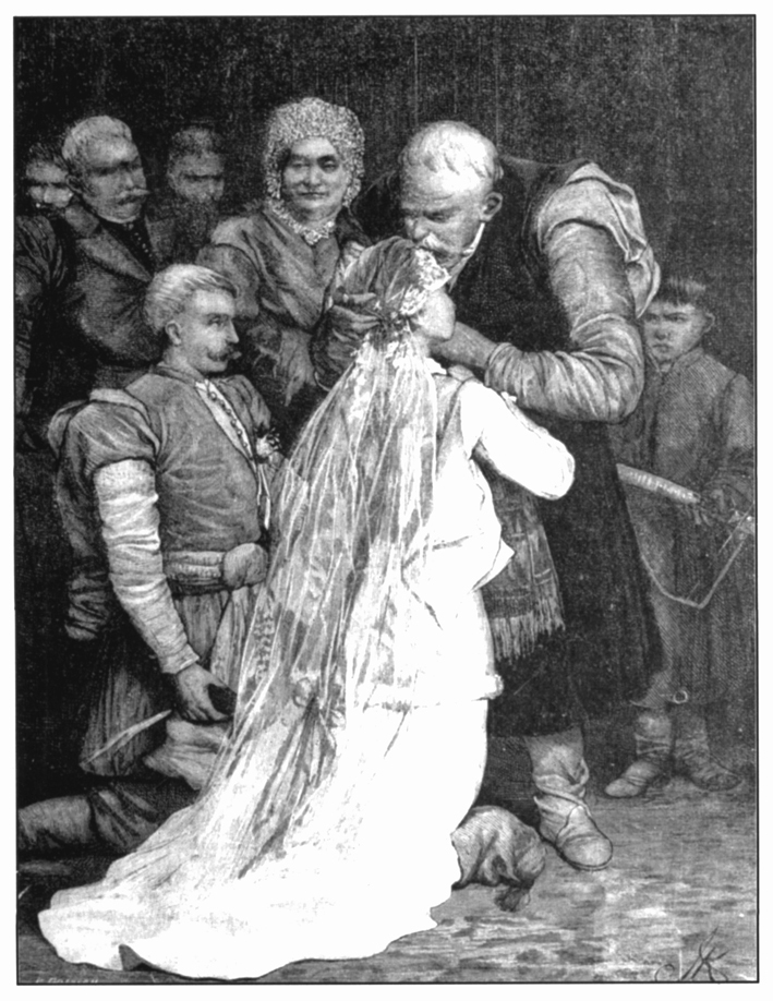 W połowie XIX w. wśród arystokracji galicyjskiej, a niekiedy również krakowskiego mieszczaństwa utarła się tradycja, że mężczyźni uczestniczący w ceremonii zaślubin, w tym także pan młody i drużbowie występowali gremialnie w polskich ubiorach narodowych składających się z żupana, kontusza, bramowanego futrem kołpaka, malowniczego pasa i karabeli, a czasem również narzuconej na ramiona delii z futrzanym kołnierzem. Zdarzały się również śluby, gdzie także panna młoda występowała w stroju polskim. Tradycję tę zapoczątkowały wyjątkowo hucznie obchodzone w 1852 r. w Krakowie zaślubiny księcia Adama Sapiehy z księżniczką Jadwigą Sanguszkówną. Krążyła wtedy nawet legenda, że panna młoda – niczym królewna z bajki – miała do wyboru trzy ślubne suknie: jedną haftowaną złotem, drugą wyszywaną perłami i trzecią polską, najskromniejszą, którą oczywiście wybrała.