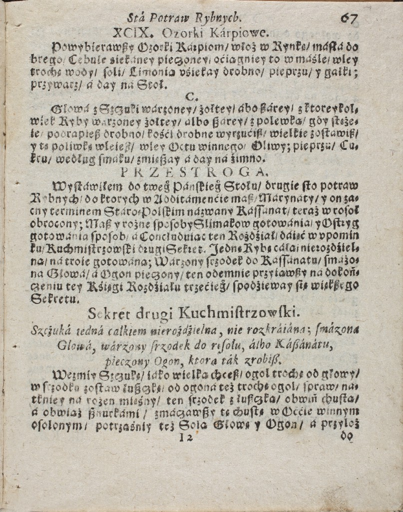 Przepis na „Szczukę jedną całkiem nierozdzielną, nie rozkrajaną, smażona głowa, warzony śrzodek do rosołu albo kaszanatu, pieczony ogon” to jedna z najważniejszych receptur Stanisława Czernieckiego, autora pierwszej polskiej książki kucharskiej z 1682 r. Czerniecki był z niej szczególnie dumny i przedstawił ją jako kończący drugi rozdział jego dzieła (poświęcony potrawom rybnym) sekret kuchmistrzowski. Choć Mickiewicz kazał Wojskiemu korzystać z „Kucharza doskonałego” Wojciecha Wielądka (pierwsze wydanie w 1783 r.), to tak inne szczegóły z tekstu „Pana Tadeusza”, przypis w „Objaśnieniach poety”, jak i sam przedstawiony tu przepis jednoznacznie wskazują na zapożyczenie go z książki Czernieckiego. Wbrew pojawiającym się czasem wyjaśnieniom, próbującym jakoś usprawiedliwić mickiewiczowski brak konsekwencji, przepisu tego nie powtórzył w swej książce Wielądko.