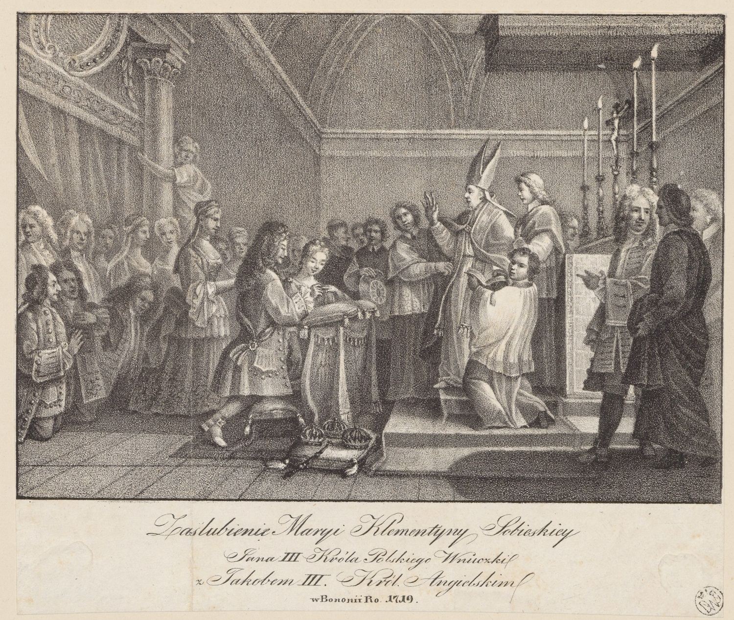 Litografia przedstawiająca zaślubiny Marii Klementyny z Jakubem stanowiła ilustrację do tekstu historyka i językoznawcy Jerzego Samuela Bandtkiego (1768–1835) „Marya Klementyna Sobieska, królewica Jakoba Sobieskiego, czwarta córka...”, zamieszczonego w periodyku „Pamiętnik Krakowski Nauk i Sztuk Pięknych" (t. I Kraków 1830, nr 2). We wnętrzu kaplicy, przed ołtarzem, biskup Montefiascone błogosławi klęczącej młodej parze, podczas gdy Jakub wkłada obrączkę na palec Marii Klementyny. W tej scenie, przypominającej spektakl teatralny odgrywany w blasku świec, towarzyszą im nieliczni dworzanie.