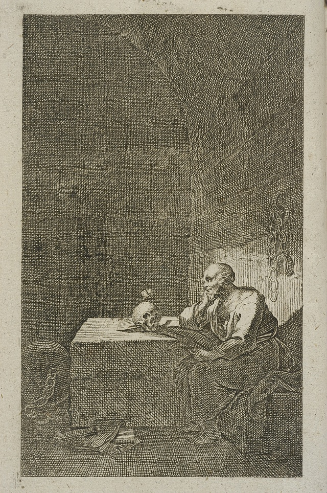 Akwaforta. Przedstawia wnętrze, pośrodku stół, po prawej stronie siedzi człowiek, który opiera się o blat stołu. Patrzy na czaszkę, która leży na stole. Na ścianie, za plecami mężczyzny widzimy łańcuch.