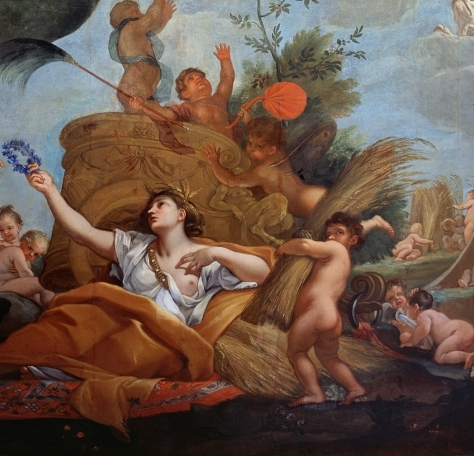 Zbliżenie na obraz. Kobieta leżąca przy snopkach siana, naokoło dużo małych amorków, które się bawią, lub dźwigają snopki. W tle pejzaż. Jest to fragment plafonu „Lato" w Sypialni Jana III w Pałacu w Wilanowie.