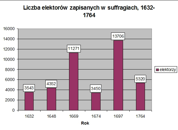 Jak widać, liczba elektorów podczas normalnych elekcji nie była duża, oscylując między 4 a 5 tys. osób głosujących. Dwa zjazdy elekcyjne były znacznie bardziej burzliwe: elekcja Michała Korybuta Wiśniowieckiego w 1669 r. i Augusta II w 1697 r. W obu tych przypadkach liczebność delegatów z każdego niemal województwa Rzeczypospolitej prawie trzykrotnie przerosła liczebność podczas spokojniejszych elekcji.