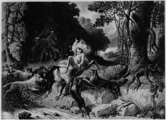 Nieszczęsna przygoda erotyczna młodego Mazepy, a zwłaszcza wyrafinowana kara, jaka go spotkała, rozpalały wyobraźnię opisujących to zdarzenie licznych Rosjan, Szwedów i Polaków, i nie tylko. Wielki Voltaire, pisząc swoją Histoire de Charles XII (1731), kazał galopować rozszalałemu rumakowi już nie przez przaśne Paskowe „chrusty”, lecz przez ukraińskie stepy, aż po kraj tatarski. I ten właśnie obraz zakorzenił się na dobre w poezji i literaturze (powieść poetycka Byrona 1819, wiersz Victora Hugo 1829, tragedia Słowackiego 1840), jak i w sztuce. Wielu malarzy podjęło ów bardzo atrakcyjny, jak się okazało, temat. Potwierdziła to wystawa pt. Mazepa, zorganizowana w 1978 r. w Rouen w Normandii, na której zgromadzono, co prawda, obrazy samych tylko francuskich mistrzów (Géricault, Delacroix, Boulanger, Vernet, Chassériau, Devilly, Guesnet, Devéria, Leray i inni), przedstawiające ukaranie Mazepy, dodatkowo wzbogacone przez Byrona o takie okoliczności, jak atakujące wilki, spotkanie z tabunem dzikich koni czy kruki krążące nad ciałem. Szczególną popularnością cieszyło się nastrojowe płótno Horacego Verneta (1789 – 1863), wyobrażające nagiego i skrępowanego sznurami, przerażonego Mazepę, unoszonego na grzbiecie rozszalałego rumaka, uciekającego przed ścigającymi go wilkami w leśną knieję. Tę dramatyczną kompozycję, osadzoną w romantycznej scenerii, powtarzano także w grafice. W litografii reprodukował ją m. in. Heinrich Papin (1830), natomiast w technikach metalowych (mezzotinta z akwafortą) rytownik paryski Alexandre Vincent Sixdeniers (1795 – 1846) przed rokiem 1847. Ta ostatnia, reprezentowana tu praca graficzna, cechuje się dobrym poziomem artystycznym i równie dobrym opanowaniem warsztatu.