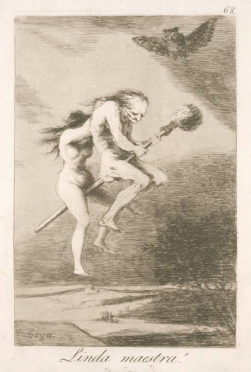 Karta ze starej księgi. Przedstawia grafikę z ilustracją. Pod grafiką ozdobne napisy. Grafika przedstawia pochyloną, podpierającą się laską starą kobietę, która trzyma w lewej ręce książkę. Kobieta ma długą suknię, długie falowane włosy i bose stopy. Zwraca się w stronę mężczyzny, który stoi z założonymi rękami i na nią patrzy. Obok mężczyzny stoi diabeł, który ściąga mu czapkę z głowy. Po lewej stronie fragment budowli.