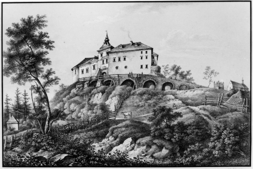 Z 1823 r. pochodzi litograficzny widok zamku w Olesku, wykonany – zapewne według własnego rysunku z natury – przez Antoniego Langego (zm. 1842), malarza – pejzażystę, dekoratora teatralnego i grafika. Ta okazała wymiarami kompozycja, odbita w lwowskim zakładzie Józefa Pillera, pochodzi z albumowego wydawnictwa Langego pt. Zbiór najpiękniejszych i najinteresowniejszych okolic Galicji (Lwów 1823). Uznanie i rozgłos zdobył Lange u współczesnych przede wszystkim jako malarz krajobrazów, zwłaszcza górzystych okolic Galicji wschodniej, po której odbył wiele wycieczek artystycznych.