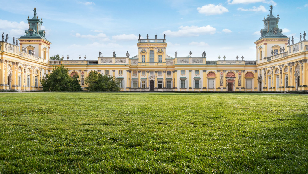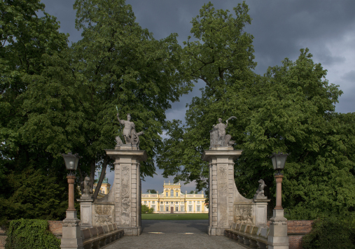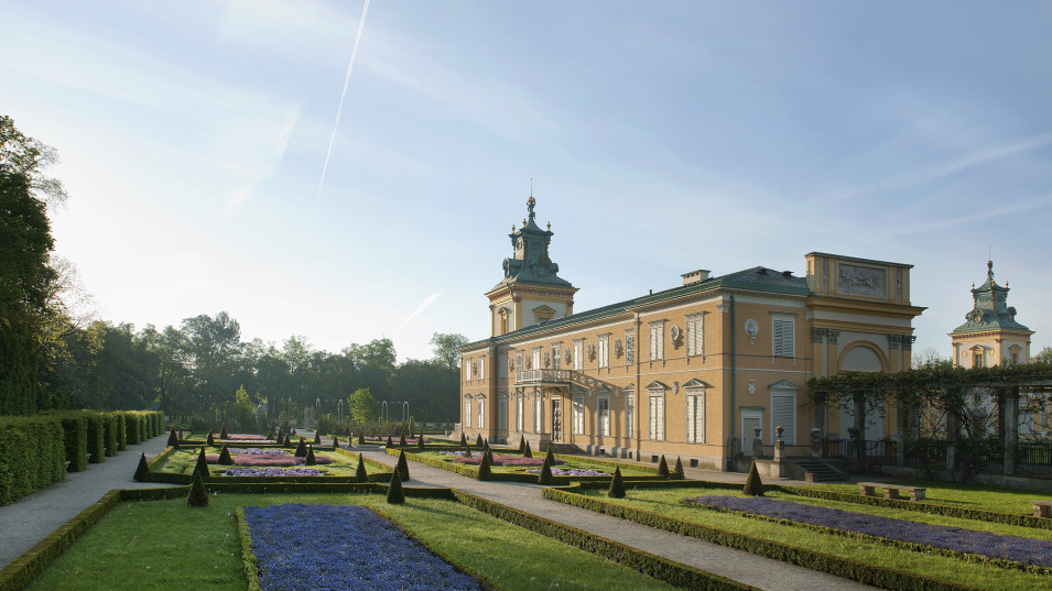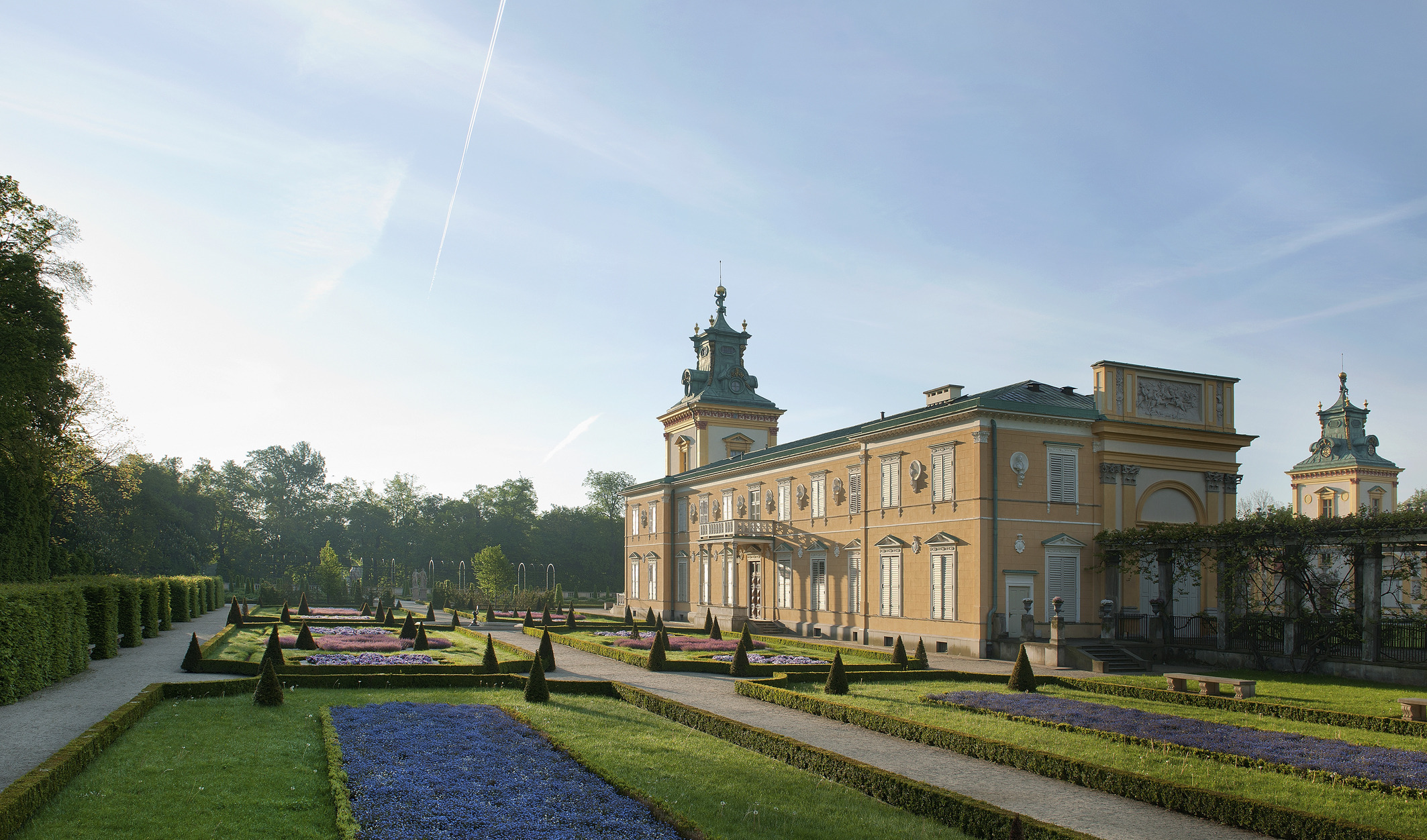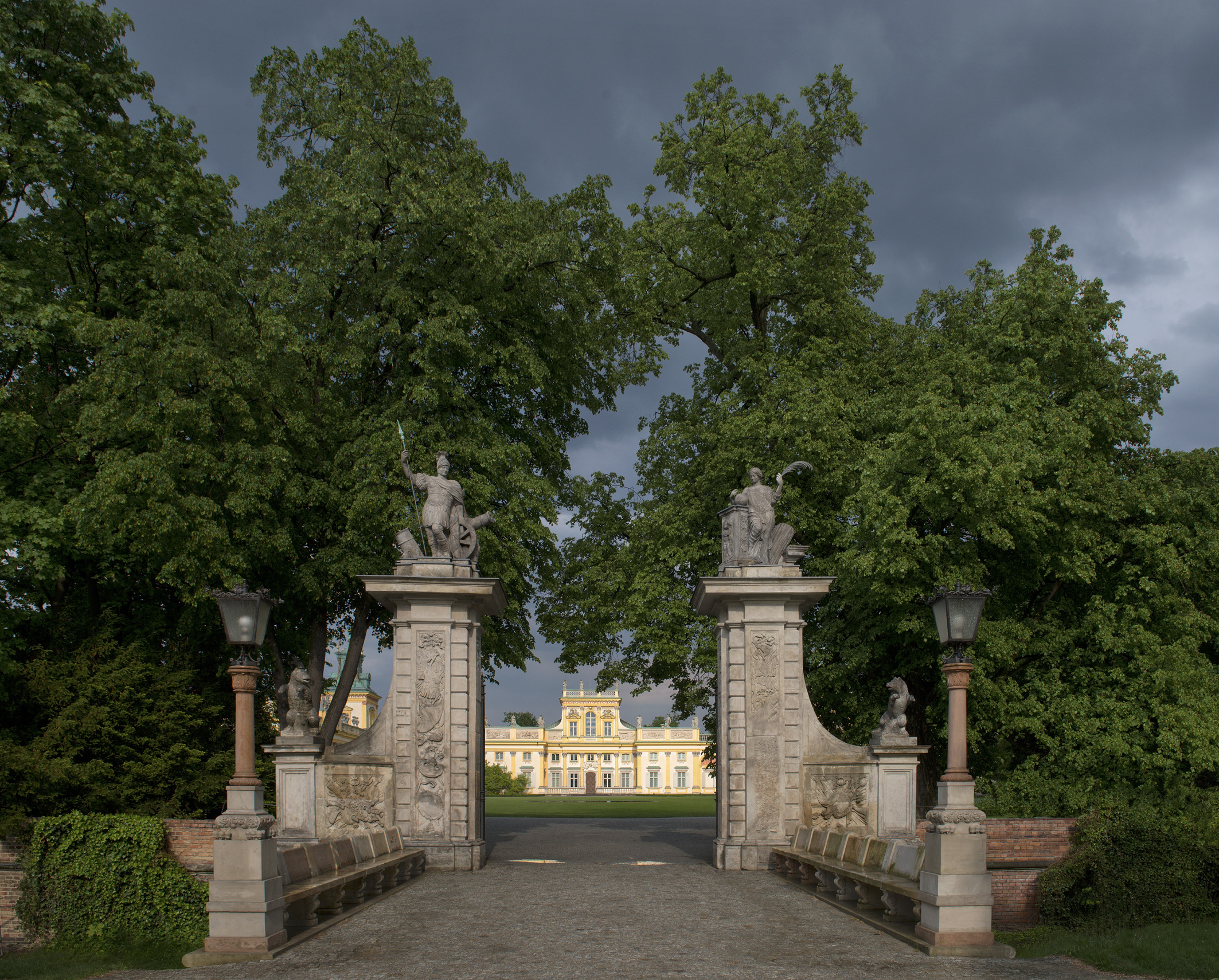 Територія перед двором палацу складається з чотирьох кварталів, обнесених цегляно-керамічною стіною та засаджених рядами дерев. Широка центральна алея є початком головної осі, що йде на захід, яка за правління короля Яна III перетворилася на 400-метровий водний канал, який розпливався перед навколишніми полями та Варшавським укосом. Наприкінці XVIII століття квартали були прорізані трипроменевою алейною системою, т. зв. гусяча лапка, яка використовувалася у французькому стилі дизайну. Протягом наступних двох століть квартали були доповнені декількома спорудами, які існують і донині: символічна усипальниця – мавзолей Потоцьких і господарський будинок доглядачів (нині каса музею), будинок Ланчі і дім Шеничувка (тепер вілла Інтрата). Внутрішньому двору палацу передує рів з цегляною підпірною стіною та барокова брама з кам’яними фігурами Марса та Венери, що символізують війну та перемогу.