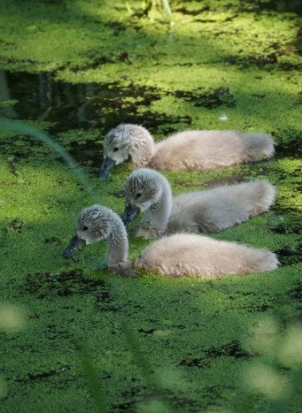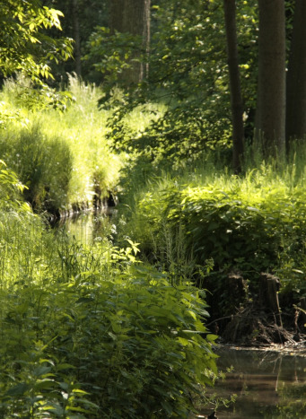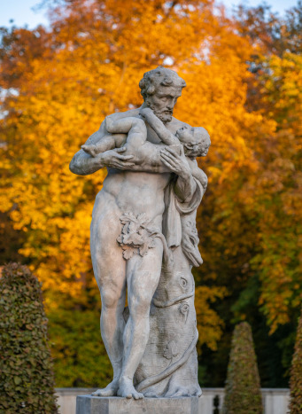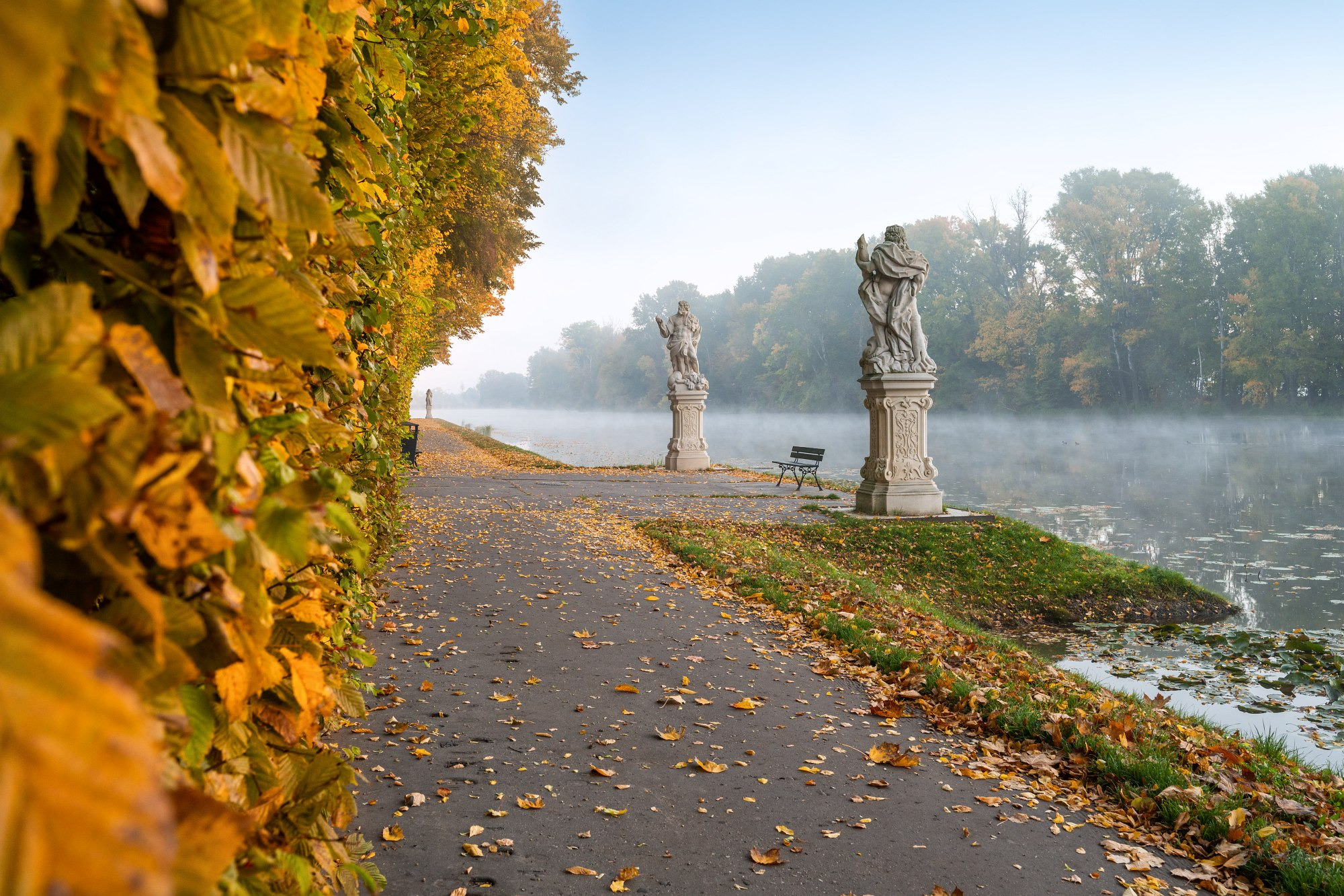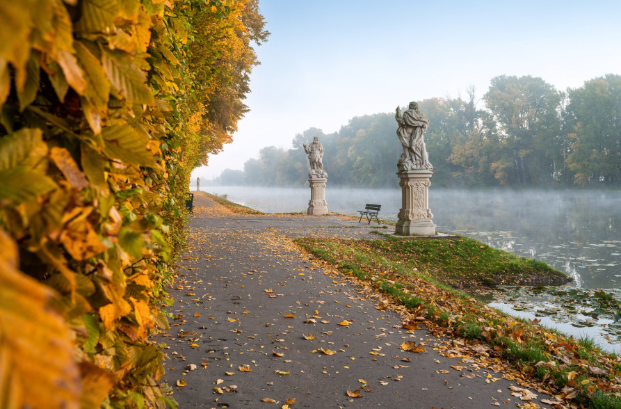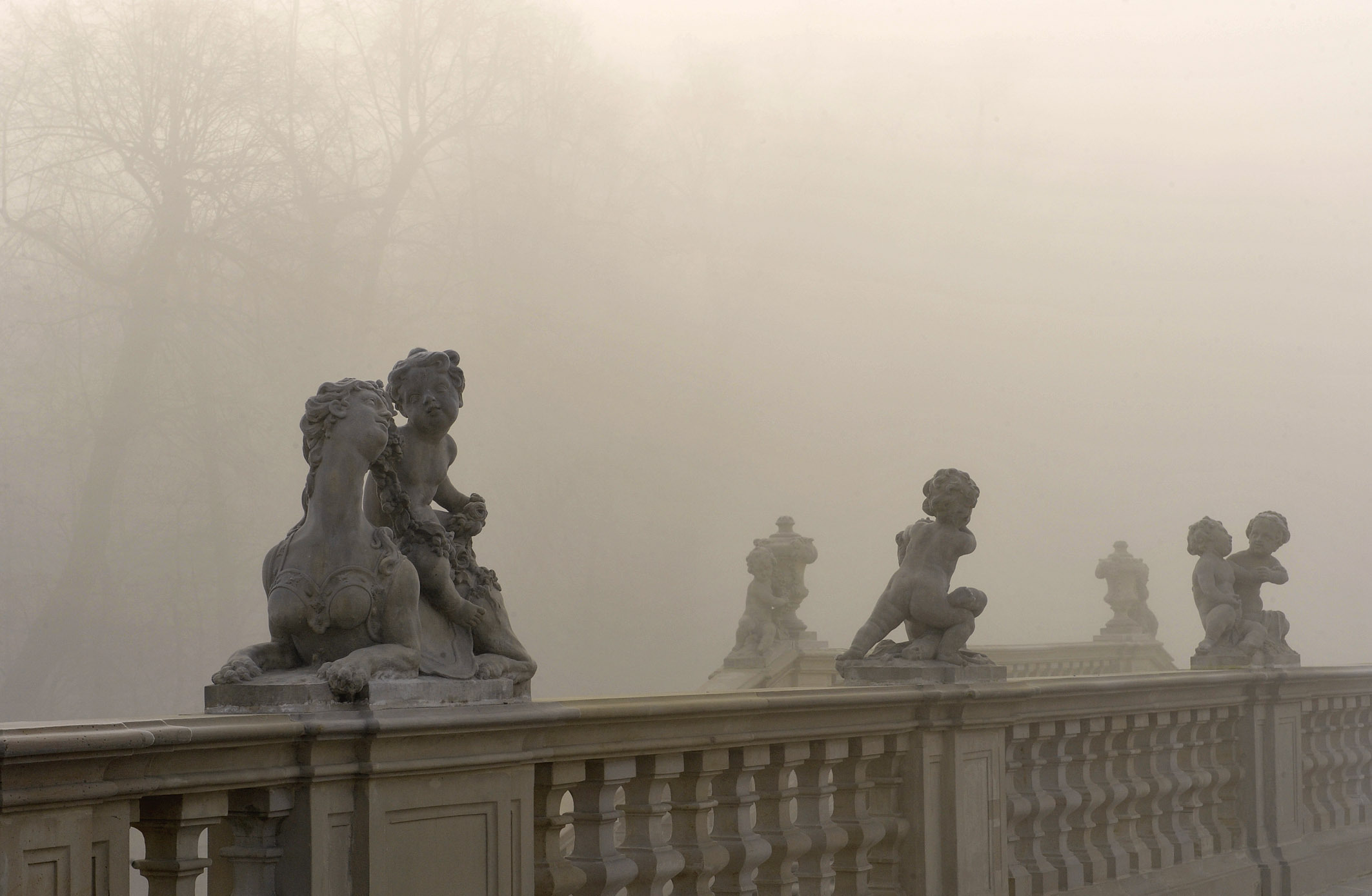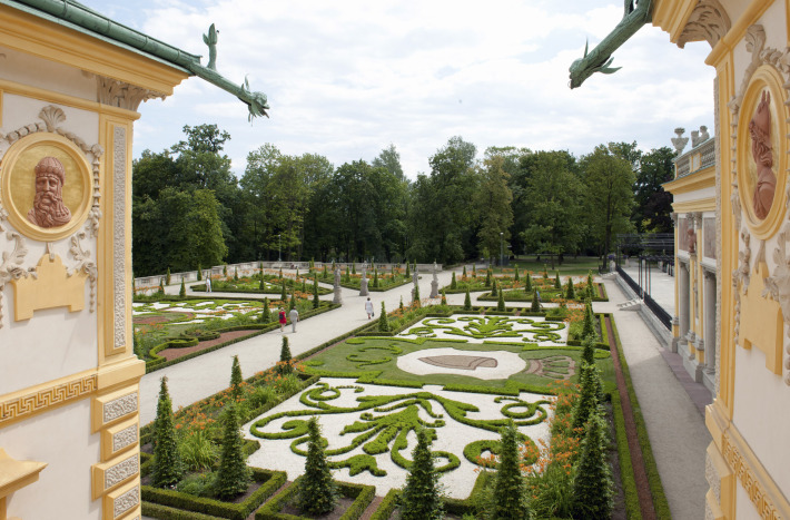 Територія перед двором палацу складається з чотирьох кварталів, обнесених цегляно-керамічною стіною та засаджених рядами дерев. Широка центральна алея є початком головної осі, що йде на захід, яка за правління короля Яна III перетворилася на 400-метровий водний канал, який розпливався перед навколишніми полями та Варшавським укосом. Наприкінці XVIII століття квартали були прорізані трипроменевою алейною системою, т. зв. гусяча лапка, яка використовувалася у французькому стилі дизайну. Протягом наступних двох століть квартали були доповнені декількома спорудами, які існують і донині: символічна усипальниця – мавзолей Потоцьких і господарський будинок доглядачів (нині каса музею), будинок Ланчі і дім Шеничувка (тепер вілла Інтрата). Внутрішньому двору палацу передує рів з цегляною підпірною стіною та барокова брама з кам’яними фігурами Марса та Венери, що символізують війну та перемогу.