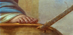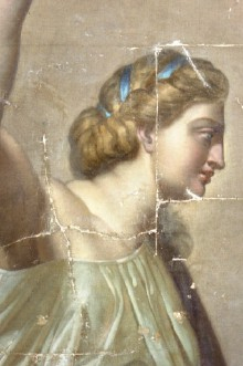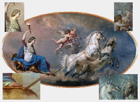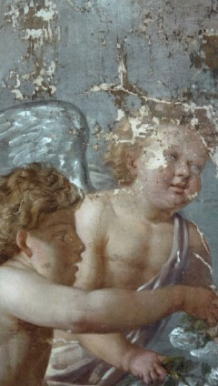 Sala z bogato zdobionymi ścianami, przedstawiającymi malowidła klasycznych postaci i kolumn. Pomieszczenie ma dekoracyjny sufit z rzeźbionymi sztukateriami oraz duże okna z ciężkimi złotymi zasłonami. Wnętrze jest umeblowane antycznymi meblami, a na środku ustawione są rzędy krzeseł. Grupa konserwatorów pracuje nad dużym malowidłem przedstawiającym scenę z powozem ciągniętym przez konie i aniołami. Malowidło jest umieszczone na podłodze, a osoby wspomagają się drabinami i narzędziami do precyzyjnej pracy. Zbliżenie fragmentu malowidła, przedstawiające stopę postaci spoczywającą na złotej kuli oraz fragment ozdobnego berła. Fragment malowidła przedstawiający dwa putta. Widoczne są uszkodzenia powierzchni, z odpryskującą farbą i ubytkami Grupa osób pracuje nad konstrukcją dużego, owalnego stelaża, który leży na podłodze. Stelaż jest wzmocniony metalowymi elementami. W tle widać drewniane meble i narzędzia Grupa osób pracuje nad dużym, owalnym malowidłem, które leży na podłodze. W tle widać ozdobne drzwi oraz ściany z klasycznymi malowidłami i rzeźbami Dwoje konserwatorów pracuje nad renowacją dużego, owalnego fragmentu dekoracji muzeum. Delikatnie odginają warstwę materiału, odsłaniając wewnętrzną strukturę. Zbliżenie na fragment malowidła przedstawiającego profil kobiety z włosami upiętymi w kok i ozdobionymi niebieską wstążką. Na powierzchni widoczne są pęknięcia i uszkodzenia. Malowidło przedstawiające dwa konie. Na powierzchni obrazu widoczne są uszkodzenia w postaci licznych rys i pęknięć. Owalne malowidło przedstawiające mitologiczną scenę z boginią jadącą na rydwanie ciągniętym przez dwa białe konie. Wokół głównej sceny znajdują się zbliżenia na różne fragmenty obrazu: profil kobiety, stopy na złotej kuli, putta oraz głowy koni. Malowidło jest bogato zdobione. Malowidło przedstawiające bogato zdobioną bibliotekę. Wnętrze jest wypełnione regałami z książkami i rzeźbami. Na środku pomieszczenia znajdują się biurka, a w tle widać duże okno wpuszczające światło. Sufit jest zdobiony freskami, a ściany dekorowane malowidłami postaci. W pomieszczeniu widoczne są dwie postacie: kobieta i mężczyzna.