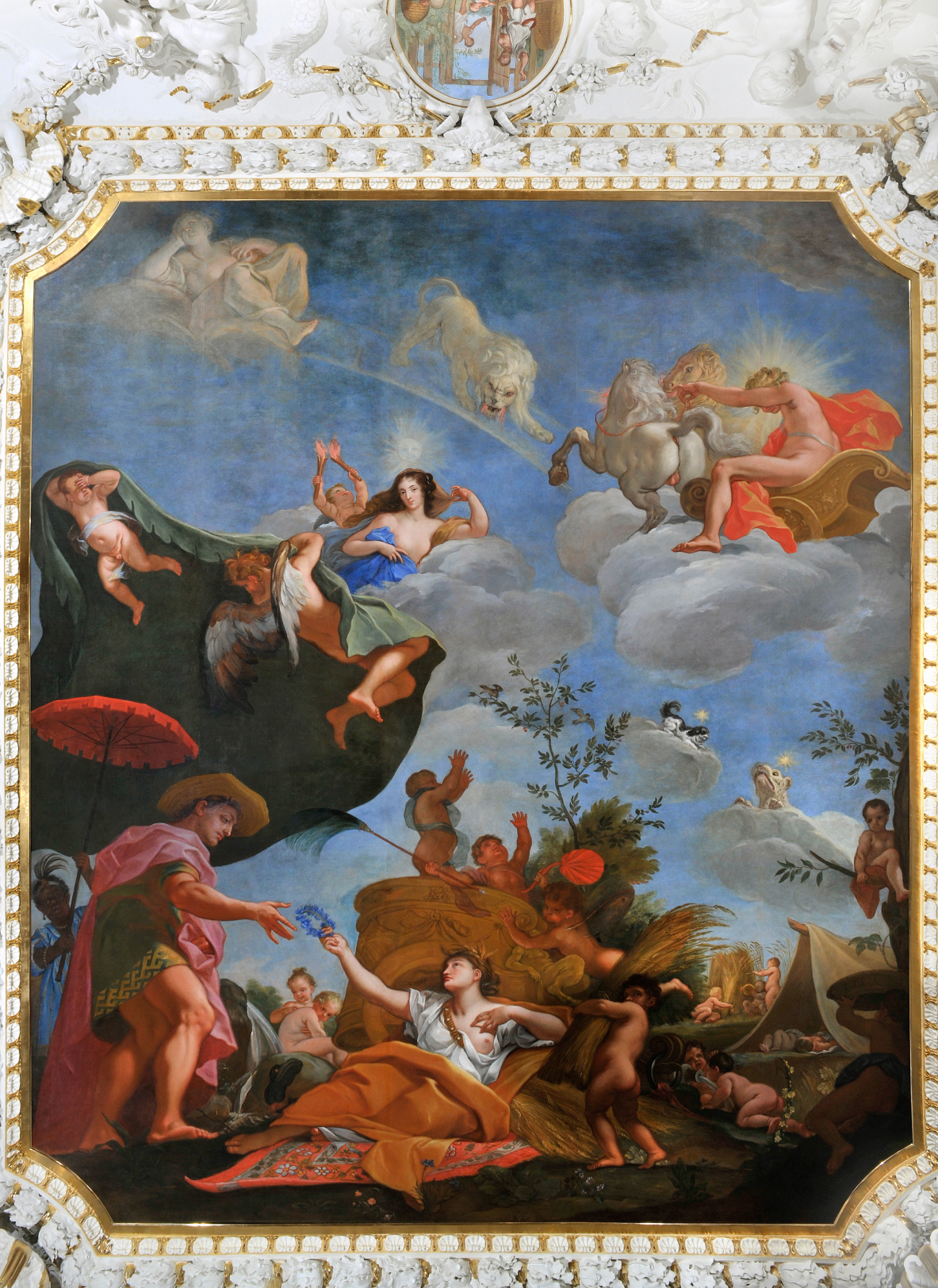 Malowidło utrzymane jest w czystych, pastelowych barwach. Dominują rozświetlone słońcem żółcie i błękity. Zgodnie z barokową modą zdobiące sufit dzieło miało sprawiać wrażenie otwierania się ścian komnaty prosto na niebiosa. Z dolnej ściany wznosi się fasada potężnego, klasycystycznego budynku zdobionego loggią z rzędem kolumn i zwieńczonego trójkątnym tympanonem. Nad nim, wśród pierzastych chmur unoszą się bóstwa z greckiej mitologii. Otaczają ich baraszkujące putta, czyli małe dzieci, które trzymają dodatkowe atrybuty podkreślające symbolikę przedstawienia.