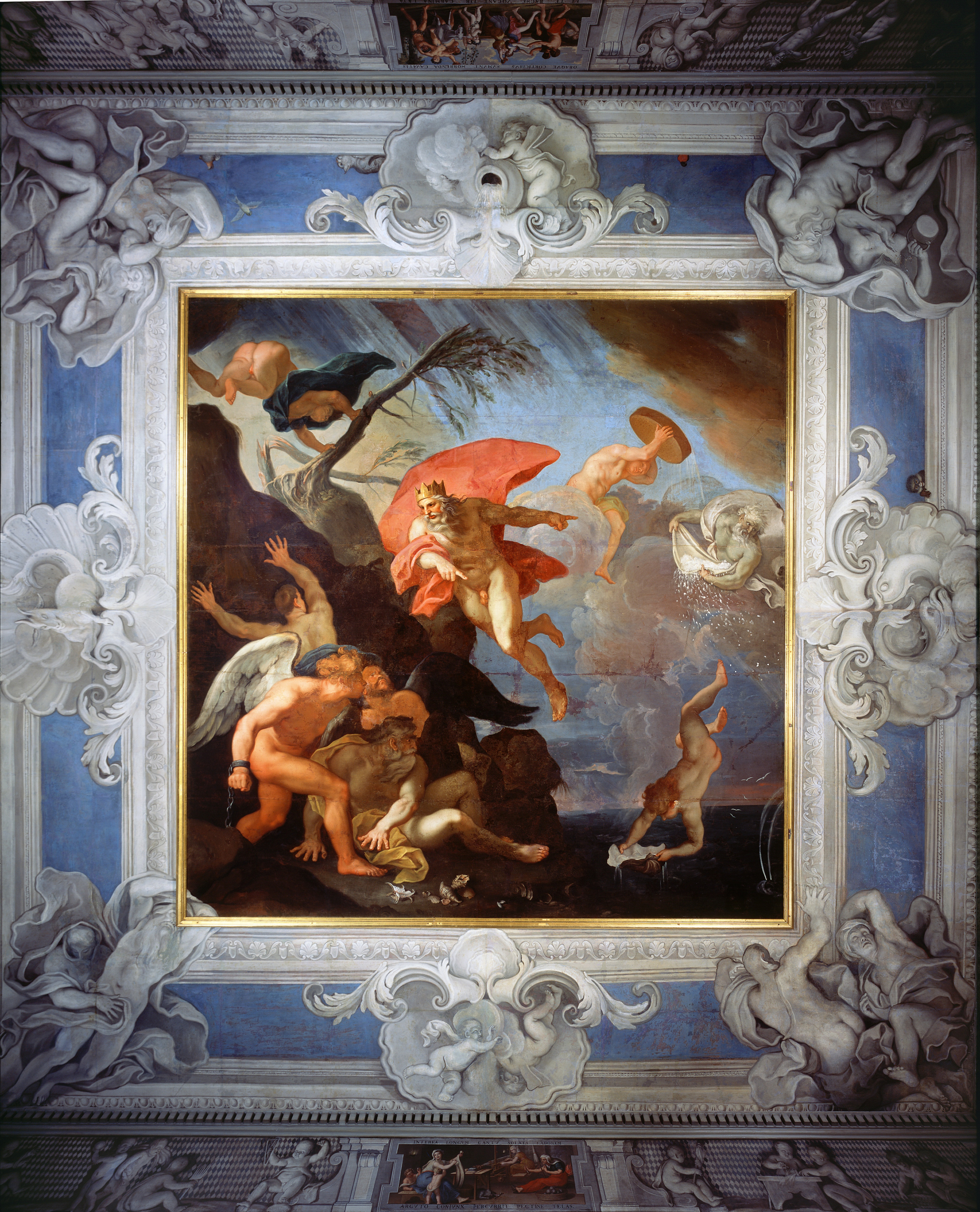 Centralne miejsce zajmuje mitologiczny bóg wiatrów Eol, ukazany w locie, z lewego półprofilu. Jest nagi, ma muskularne ciało dojrzałego mężczyzny. Na plecach powiewa mu czerwony obszerny płaszcz przewieszony przez prawe ramię. Głowę zdobi złota korona, spod której rozsypują się na wietrze półdługie siwe włosy, łączące się z rozwianą siwą brodą. Groźne, surowe oblicze wyobraża majestat. Władczość podkreślona jest rozkazującym gestem króla – oba ramiona i palce wskazujące są wyprostowane, lewa ręka nieco z tyłu, prawa z przodu. Ten gest nie pozostawia wątpliwości, król nakazuje posłuszeństwo.
