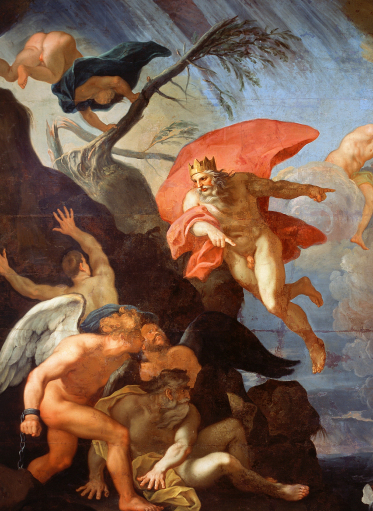 Poniżej, w lewym dolnym rogu obrazu, u podnóża nadmorskiej skały kłębi się grupa czterech skrzydlatych mężczyzn. To zimowe wiatry. Są w różnym wieku, niemal nadzy, częściowo tylko okryci płaszczami. Ich jasne ciała odcinają się od ciemnej plamy skały. Dwaj siedzą, gotowi w każdej chwili zerwać się do lotu. Jeden stoi w półrozkroku, w bojowej pozycji, ale jego ręce spętane są kajdanami. Kolejny wspina się po skale, jakby szukając ucieczki. Wszyscy wyglądają na gotowych do ataku, a jednocześnie przerażonych. Ze strachem spoglądają do góry na króla wiatrów.
