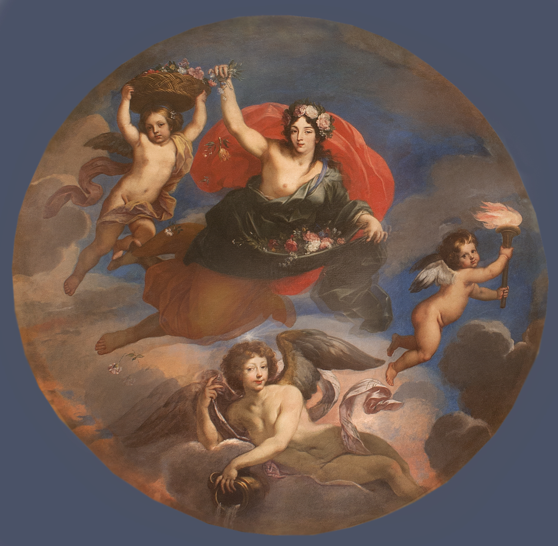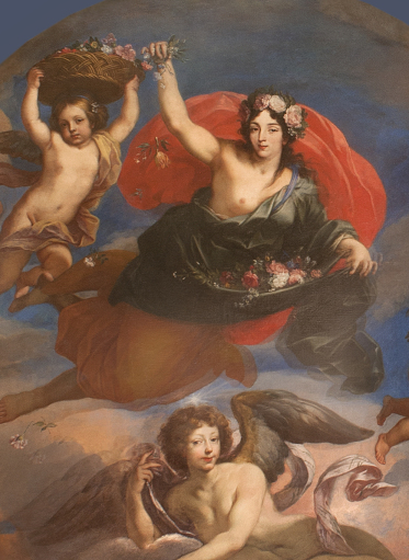Przed nią lecą dwa uskrzydlone putta niosące płaski wiklinowy kosz wypełniony kolorowymi kwiatami.