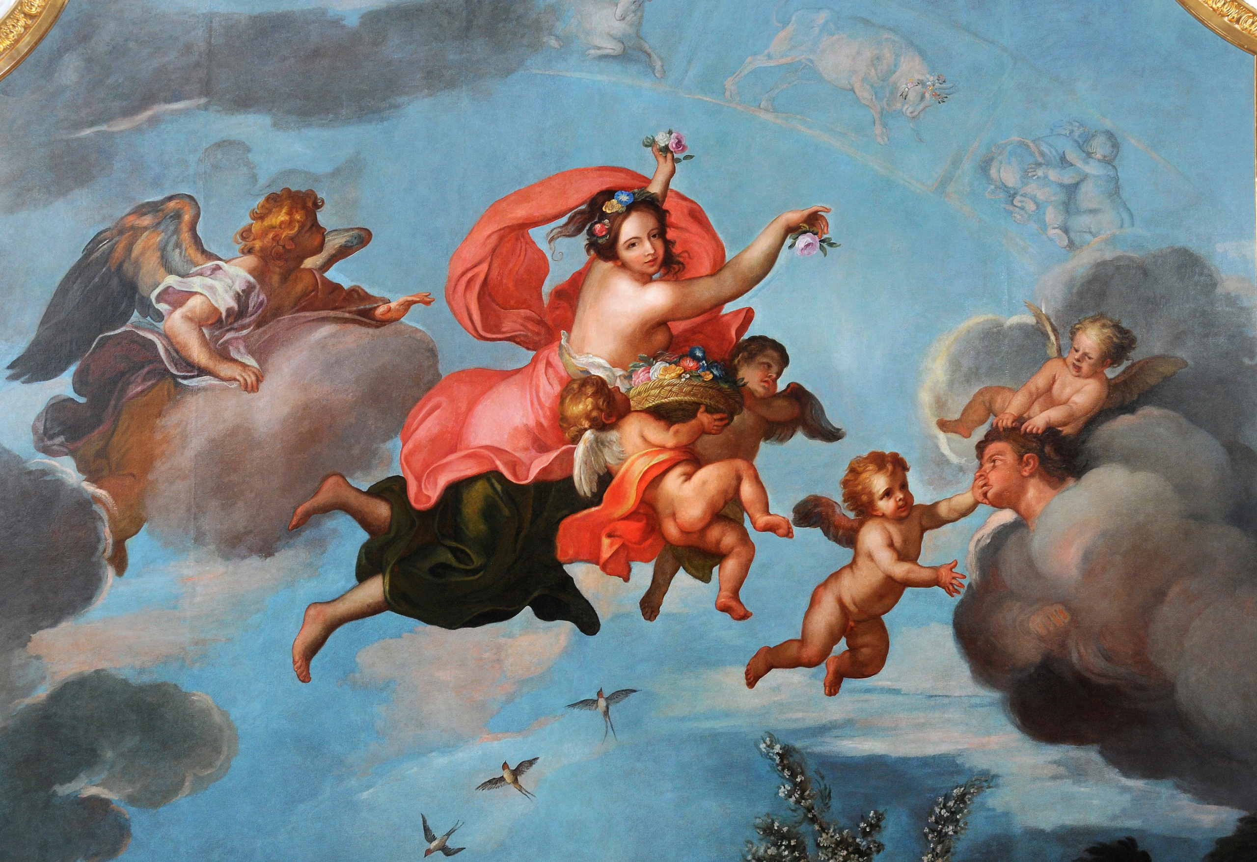 Z lewej strony towarzyszy im uskrzydlone, odziane w powłóczystą szatę putto leżące brzuchem na chmurze i spoglądające ciekawie na rozsypywane przez Florę kwiaty.