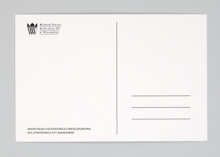 Pocztówka z widokiem Pałacu od dziedzińca z wieżą zegarową.