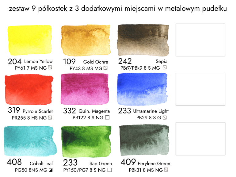 Niewielka metalowa kasetka zawiera 9 półkostek z dodatkowymi 3 wolnymi miejscmi pozwalającymi na rozszerzenie palety kolorów według własnych upodobań.