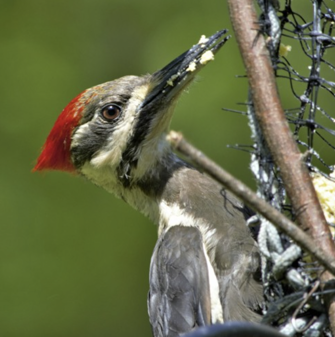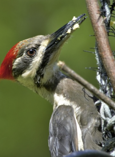 Oczy są czerwone, a dziób ciemnoszary, wydłużony i lekko spiczasty. Dzięcioł używa go do wykuwania dziupli w drzewach oraz do poszukiwania pożywienia – odłupywania kory drzew czy rozdziobywania szyszek.