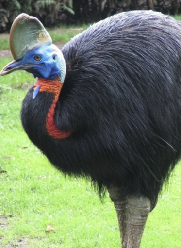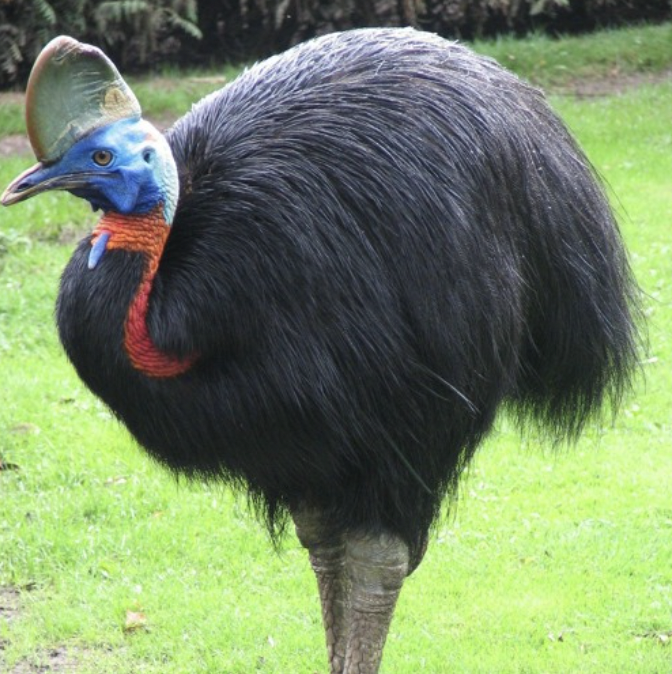 Krępy korpus ciała kazuarów ma mocno wypukły, owalny kształt nieco zwężony od strony szyi. Ciało kazuara, prócz nieopierzonej głowy, szyi oraz nóg, w całości pokryte jest długimi, szczecinowatymi, czarnymi piórami o włosowatym kształcie. Szorstkie, sztywne, połyskujące pióra silnie przylegają do siebie i opadają w dół, zwisając z obydwu stron ciała. Dosyć długa, gruba, esowato wygięta szyja pokryta jest silnie pomarszczoną skórą w połyskującym intensywnie niebieskim kolorze, jedynie od strony karku jest pomarańczowo-czerwona. Z przodu szyi w dół zwisają dwa spłaszczone fałdy skórne, tzw. korale o długości około 18 centymetrów i w intensywnie czerwonym kolorze. Głowa ma metaliczny, jasnobłękitny kolor, niekiedy z zielonkawo-żółtym poblaskiem. Dziób jest krępy, lekko wygięty w dół i zwężający się ku wierzchołkowi, mocny, ciemnoszary niekiedy z żółtym nalotem. Wzdłuż wierzchołka głowy w górę na wysokość około 13–17 centymetrów wyrasta brązowy hełm – bocznie spłaszczona rogowa narośl o trójkątnym kształcie. Oczy są duże, pomarańczowe z czarną obwódką. Całe ciało ptaka wznosi się w górę na wysokich, masywnych nogach zakończonych trzema palcami. Palce wyposażone są w długie, sztyletowate pazury, a najdłuższy z nich wyrastający ze środkowego palca może mierzyć nawet 12 centymetrów. W sytuacji zagrożenia kazuary wykorzystują każdy z atrybutów swej budowy: rogowy hełm, ostry twardy dziób oraz potężne nogi umożliwiające szybkie bieganie i skakanie na wysokość nawet 1,5 metra, a także zdolność kopania.