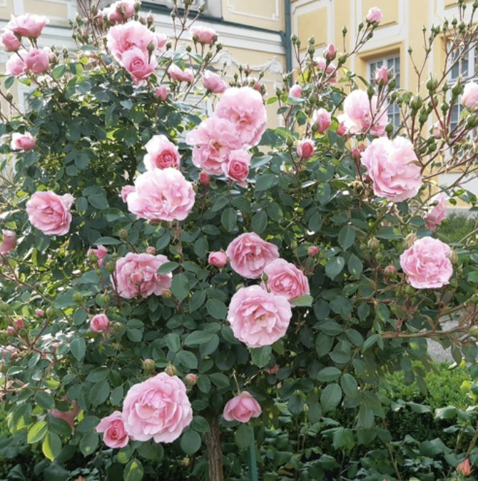 Prostokątne kwatery wypełniają wysokie krzewy o dużych, pełnych, kremowo-różowych kwiatach. Wewnętrzne okrągłe kwatery porastają krzewy o ciemnoróżowych, intensywnie, słodko pachnących kwiatach.