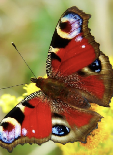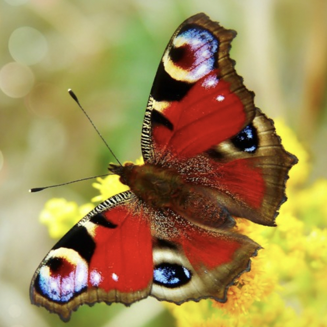 Od pawiego oczka brzegiem skrzydła w dół układa się połyskujący podłużny wzór w czarno złote pasy.