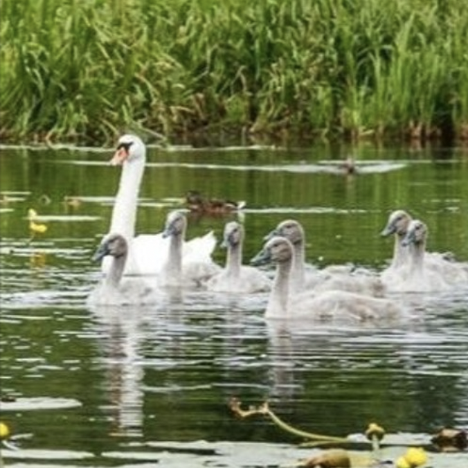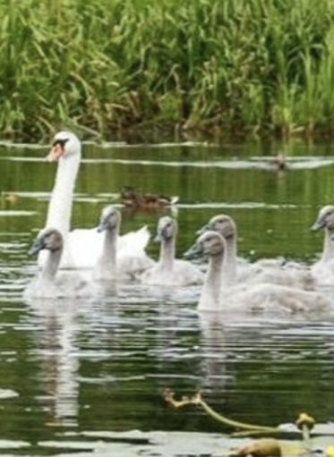Północna część jeziora, a w szczególności zatoka, są szczególnie preferowane przez parę łabędzi niemych: osobliwych, dużych, białych ptaków, z charakterystycznie haczykowato wygiętą, długą szyją. Mają one pomarańczowy, spłaszczony dziób z czarną naroślą u nasady i duże, czarne nogi z palcami spiętymi błoną pławną. Dorosłe ptaki dochowały się też gromadki młodych, z którymi często pływają po jeziornych wodach.