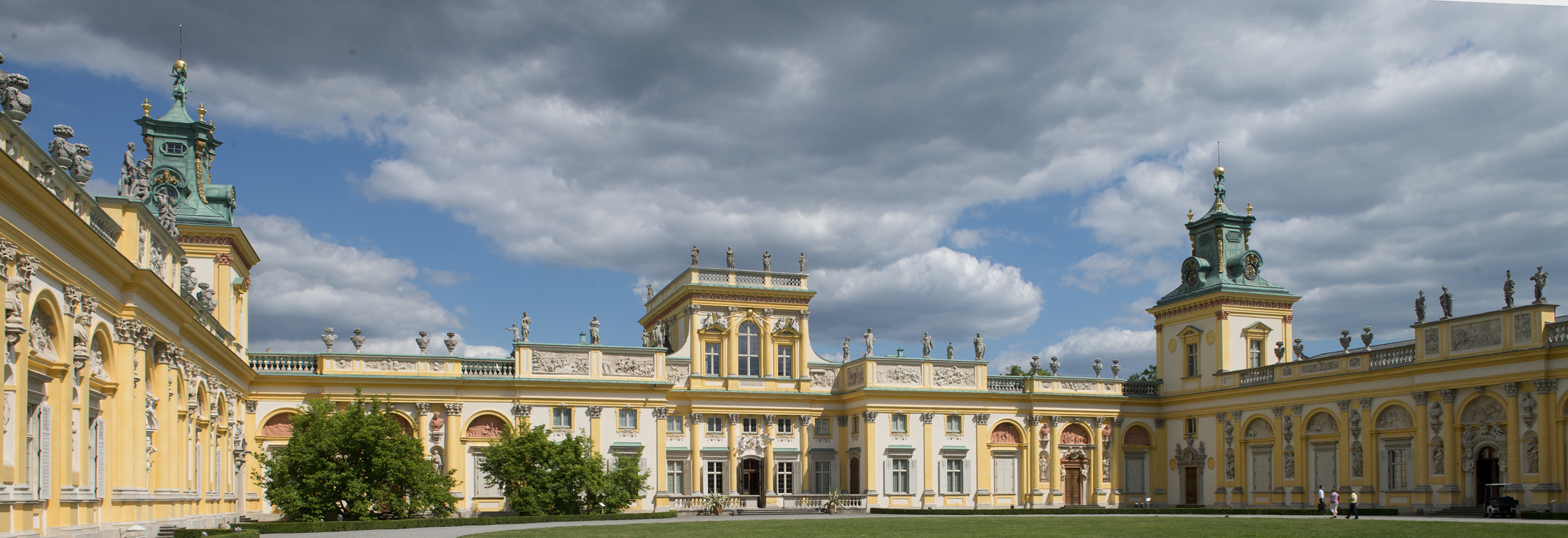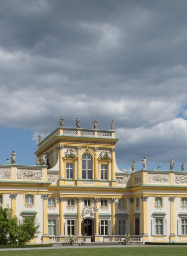 Wywodząca się z XIX wieku zgaszona, piaskowa ochra ustąpiła miejsca rytmom żywego złocienia wilanowskiego. Pokryte nim półkolumny, pilastry, gzymsy i łuki, tworzące porządek architektoniczny pałacu, wyraźnie rysują się na tle lekko ocieplonej bieli ścian. Kontrast podbijają intensywnie ceglaste kolory płaskorzeźb w archiwoltach oraz popiersi. To efekt odkrycia śladów pierwotnego, trójbarwnego wystroju elewacji pałacu. Kompozycji dopełnia pistacjowo-zielona blacha, którą pokryto hełmy wież oraz wąskie pasy dachu nad gzymsami.