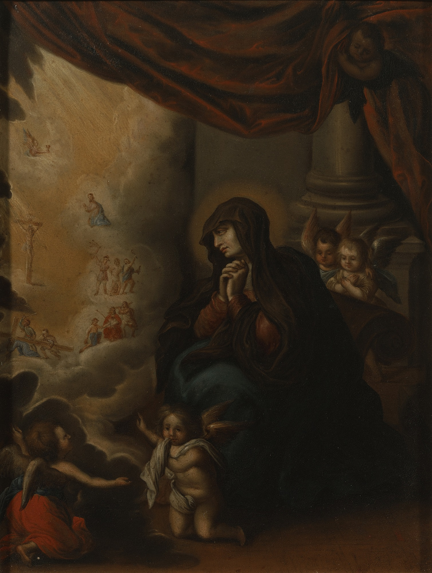 W obrazku tym przenika się kilka rzeczywistości. Putto w prawym górnym rogu kompozycji podnosi ciężką kotarę, odsłaniając scenę rozgrywającą się w bliżej nieokreślonym wnętrzu, zasygnalizowanym przez kolumnę i delikatnie zaznaczone linie posadzki. Na utworzonej w ten sposób scenie teatru widzimy klęczącą Maryję ciemnym płaszczu z dłońmi złożonymi w dramatyzowanym geście modlitwy. Towarzyszą jej cztery putta. Jedno z nich, ocierając łzy, zwraca się w stronę widza i wskazuje na wizję, w którą wpatruje się Maryja – pięć tajemnic bolesnych różańca: modlitwę w Ogrójcu, biczowanie, cierniem koronowanie, niesienie krzyża i śmierć Chrystusa na krzyżu. Nadprzyrodzony charakter widzenia podkreślają obłoki przesycone światłem, tworzące złote tło. Ostre światło rzeźbi ich kontury, potęguje kontrasty.