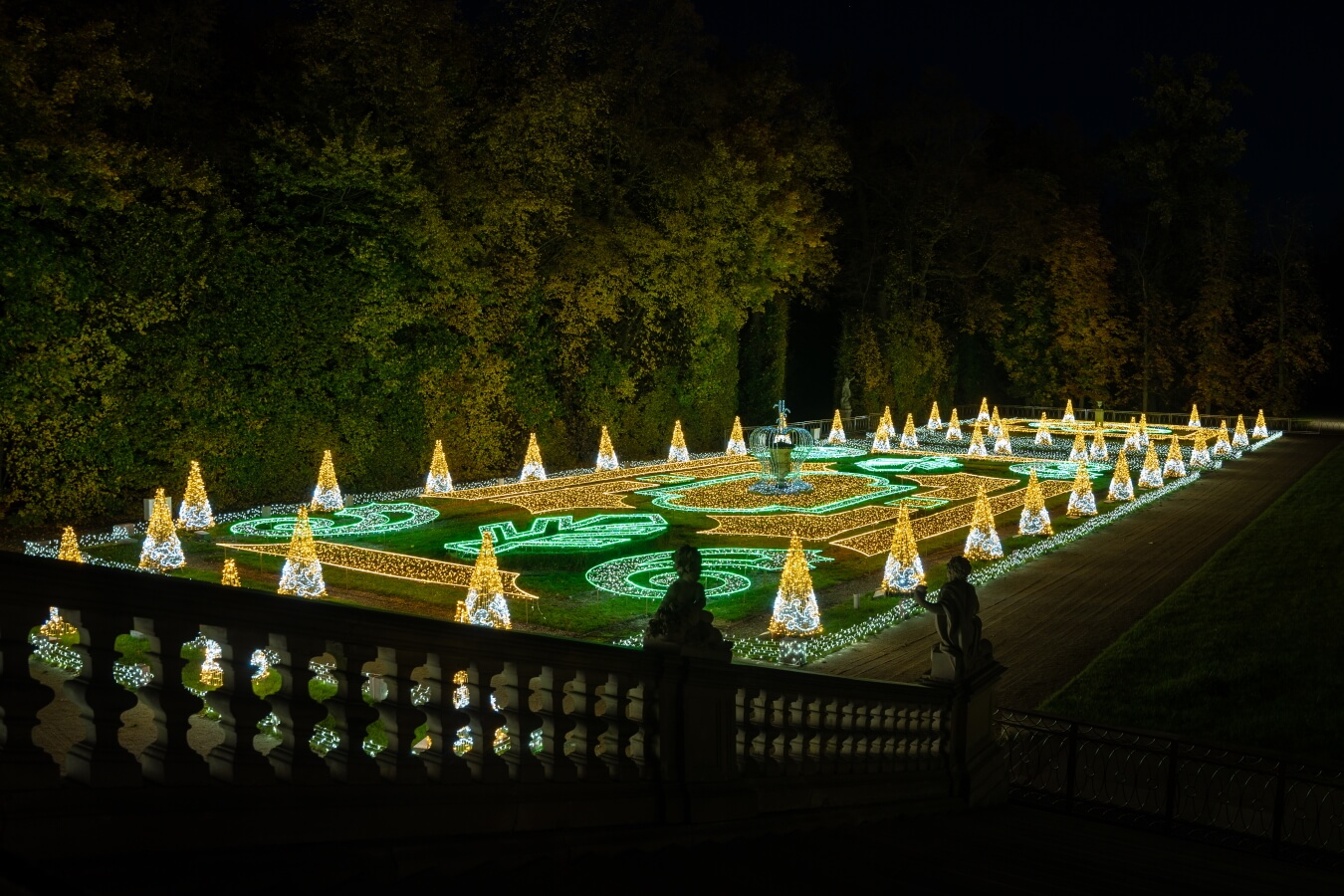 Muzyczny Ogród Marzeń znajduje się na tarasie dolnym barokowego ogrodu. Odbywające się w nim pokazy świetlno-muzyczne można podziwiać z wysokości tarasu górnego, co daje niesamowity efekt! Światło wiernie odwzorowuje i wypełnia zmieniającymi się barwami geometryczne kształty ogrodu, a wszystko to w rytm muzyki klasycznej.